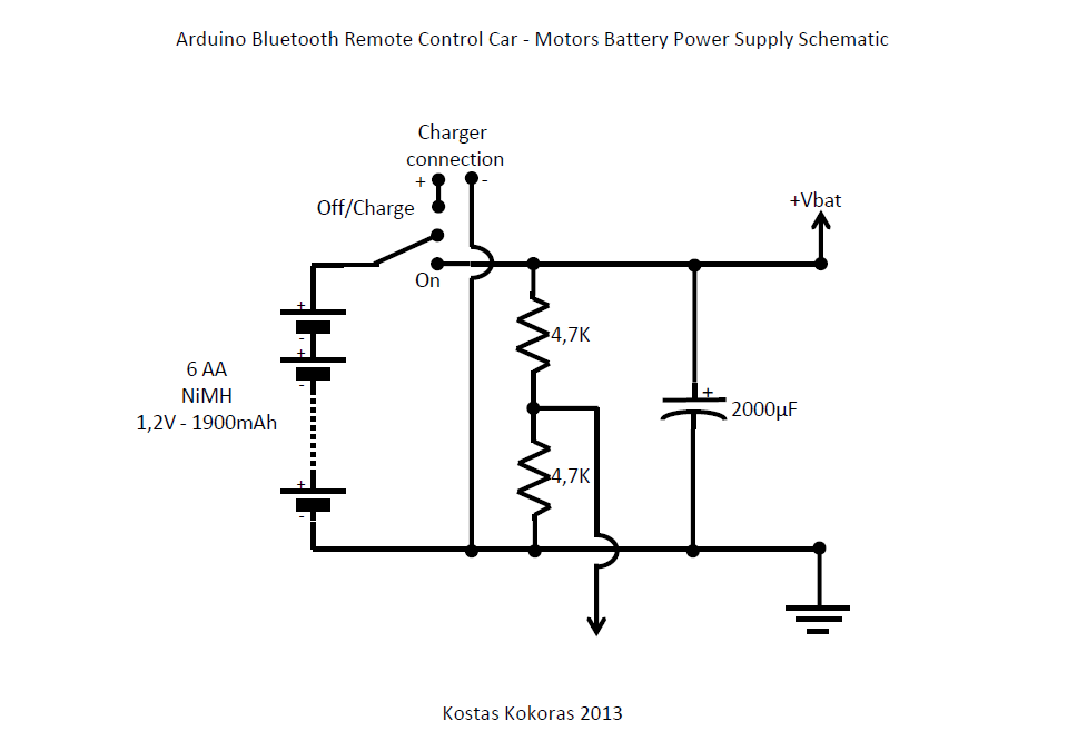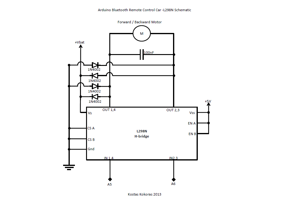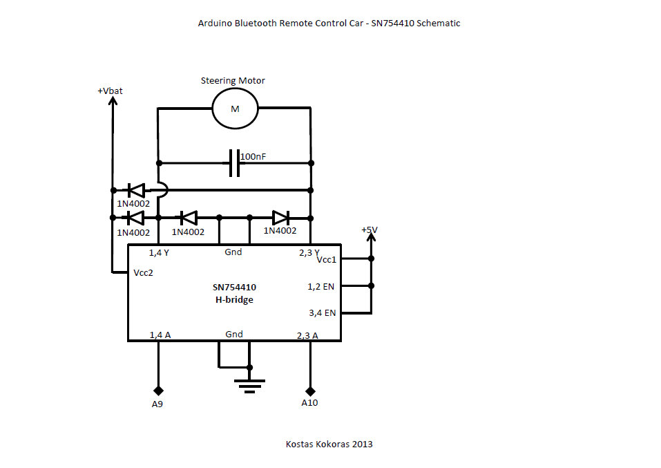 For the car i removed all the electronics except the motors and i installed 6 new AA 1,2V rechargeable NiMh 1900mAh batteries. I designed new electronics based on Arduino with a HC-05 Bluetooth module and two h-bridge ic's. The SN754410 for steering motor and the L298N for forward/backward motor. For both ic's i connected parallel the channels, 1 with 4 and 2 with 3. Here are some pictures of the building procedure |